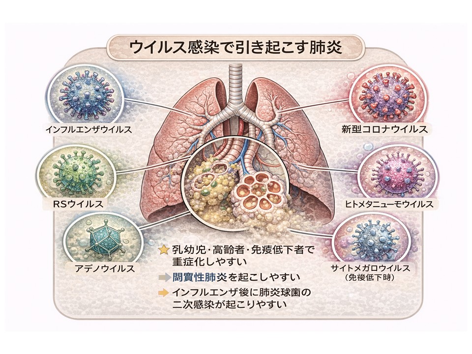 - インフルエンザウイルス:高齢者で肺炎を合併
