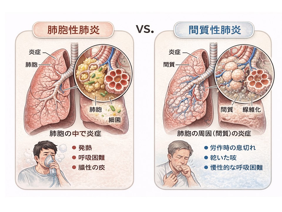 • 間質性肺炎:肺胞の周囲に炎症が起こり、治りにくく肺機能が低下しやすいタイプである。主にウイルスや一部の細菌・真菌が関係する。